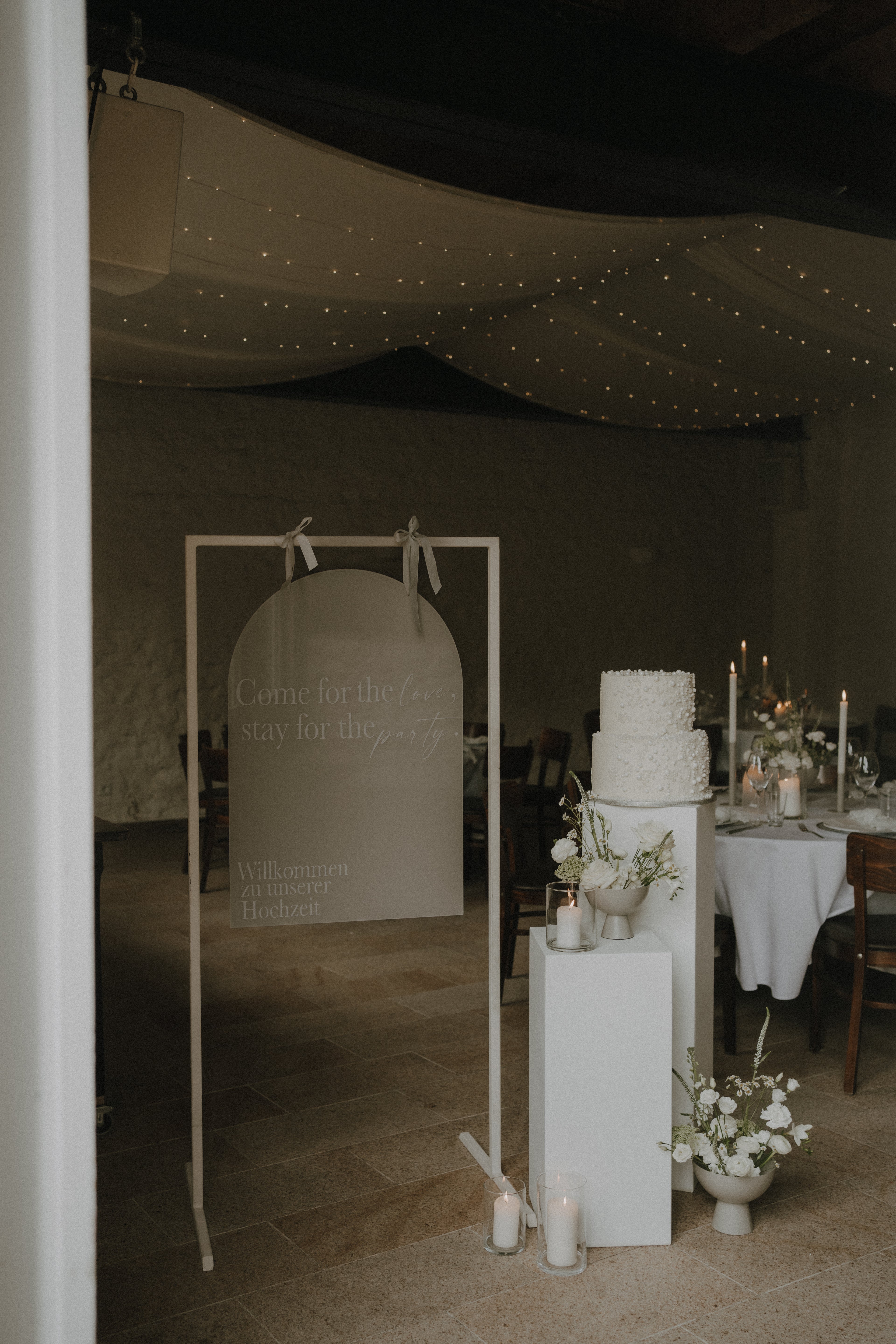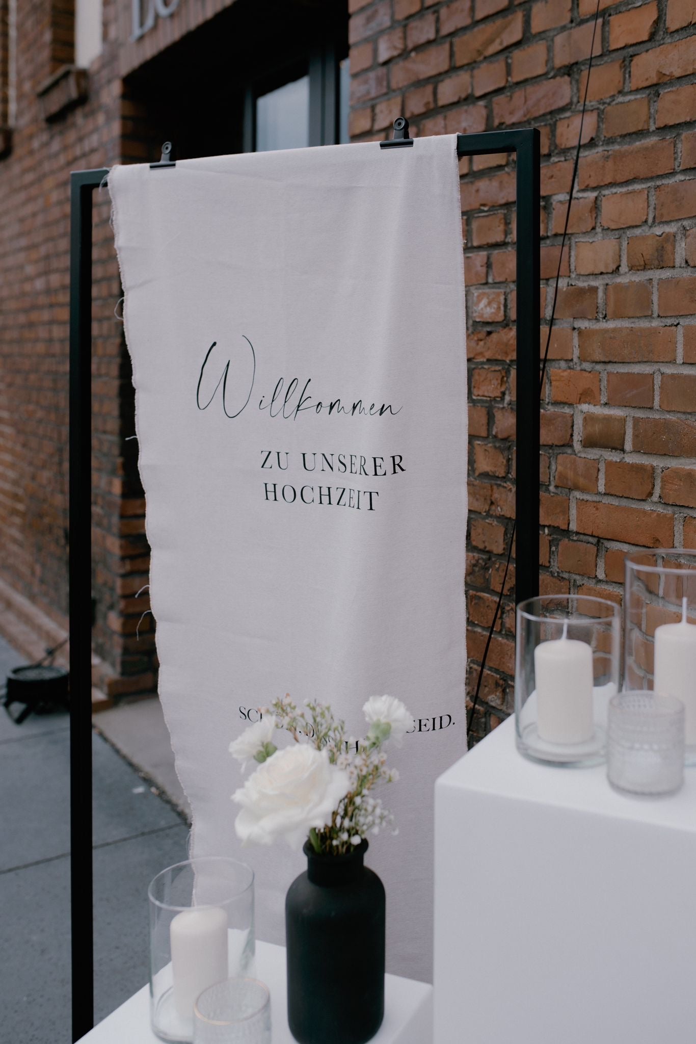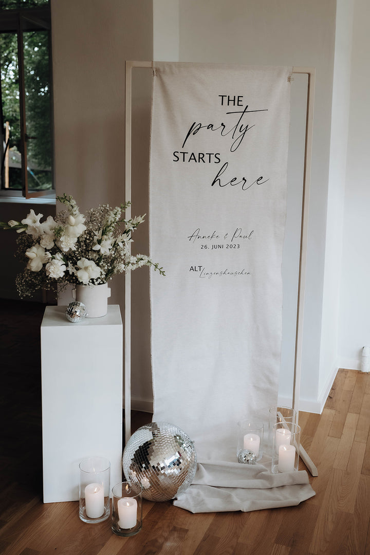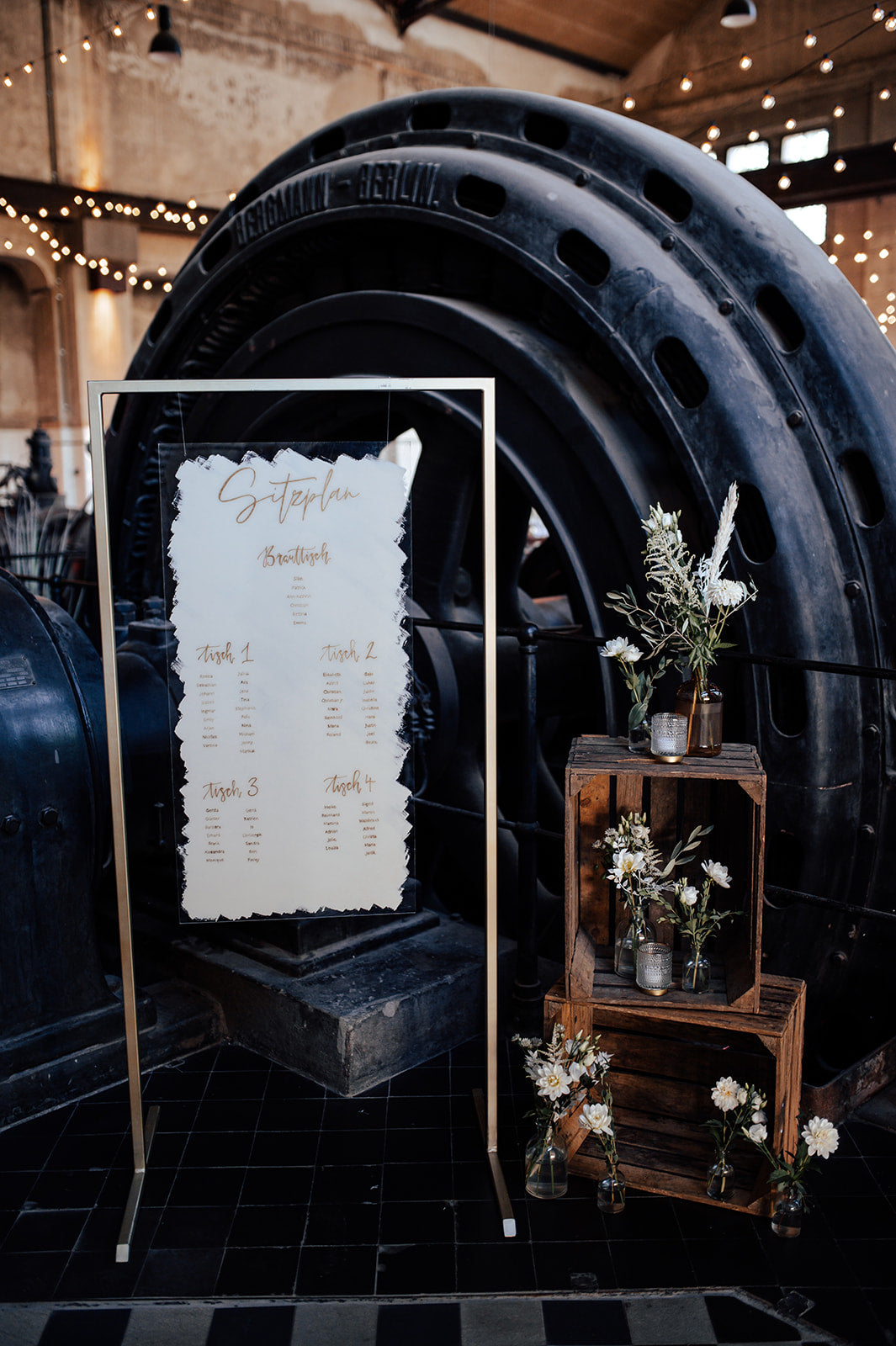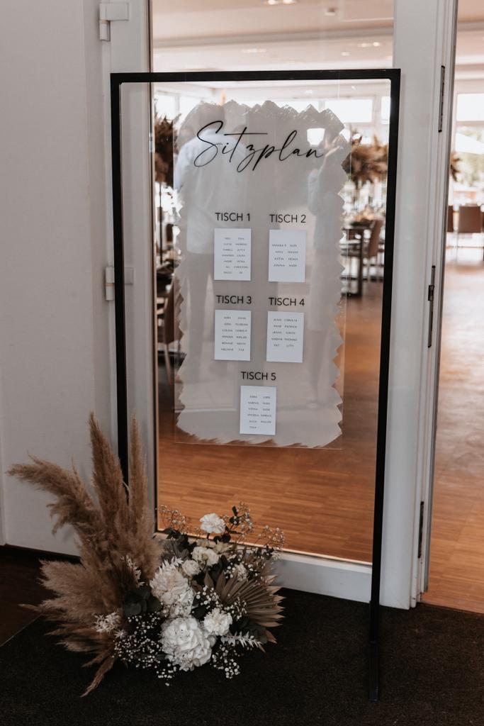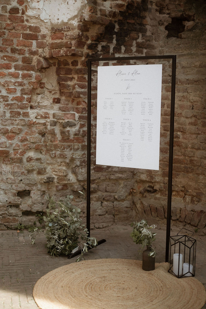 Die Willkommensschilder & Sitzpläne können mit einem Band oder einer Klammer im Gestell befestigt werden.