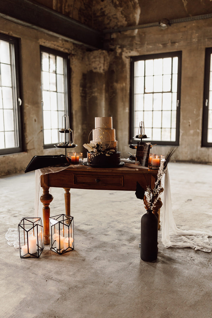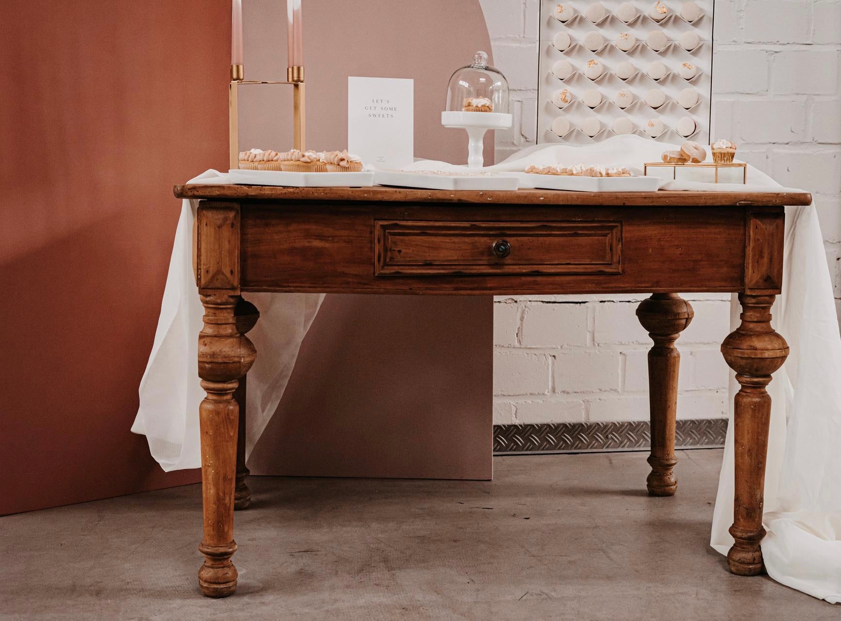 Wunderschöner alter Holztisch, der ganz vielseitig einsetzbar. Ob als Trautisch, für die Candybar, das Gästebuch oder als Highlight für die Torte.